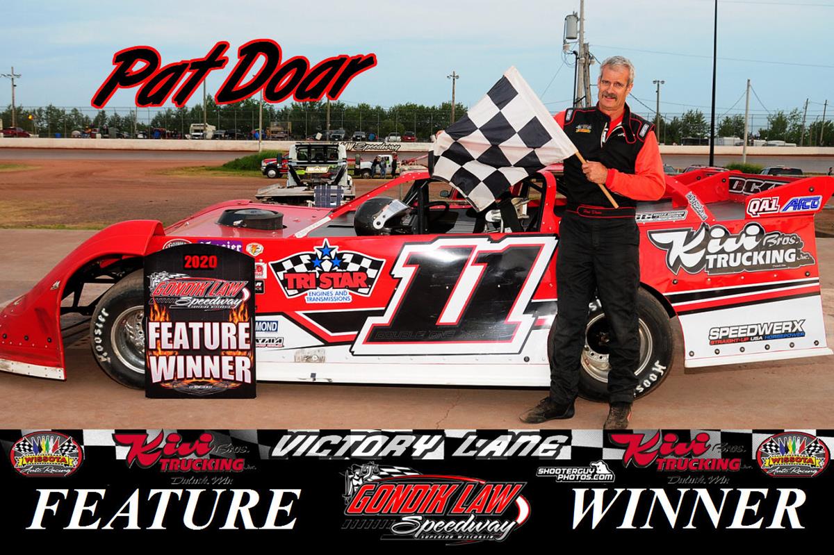 snare second. The two battled back and forth until Doar tried the top of the slippery track and was able to cross the line ahead by a half a car length. Once Doar was able to clear Prochnow he began to pull out to a big lead. Prochnow was able to fend off the pack to finish second while tenth starting Travis Budiaslovich moved up to finish third ahead of Kaanta in fourth and Jeff Massingill in fifth. It was Doar's second feature win of the shortened 2020 season at GLS.