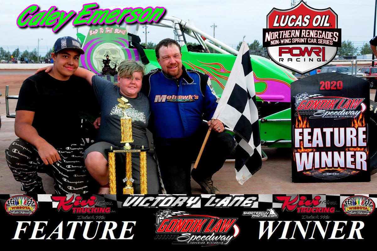 The Northern Renegade wingless sprints put on a good show, but a wild tangle on the front stretch eliminated the cars of Brian Trembath, Jori Hughes and Leah Steahl. None of the involved drivers were injured in the crash and they all stayed on their wheels. The incident came at the start of the 20 lap feature leaving nine of the dozen starters to finish the race. The restart say Ken Hron out in front where he stayed for a number of laps while Caley Emerson and Lance Solem tried with little success to make inroads into Hron's considerable lead. At the half way point Hron led Emerson, Solem, Rick Niemi, Chris Lewis and Paul Schultz. Not much changed as Hron held a long gap over Emerson. The second and final caution flag flew for a piece of debris on the back stretch and the restart came with eight laps to go. The