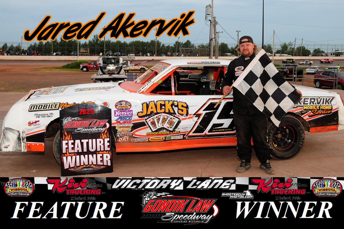 Former track champion James Vendela tried his best to take the win in the WISSOTA Pure Stock main event. Two early caution flags, one for McLean Andrews who stopped with a flat tire. The second was for a spinning Cory Jorgensen which produced a black flag for Andrews. The restart saw a battle between Vendela, Jared Akervik, Aaron Bernick and Trevor Treviranus that saw Akervik edge past Vendela to take his third win of the season.